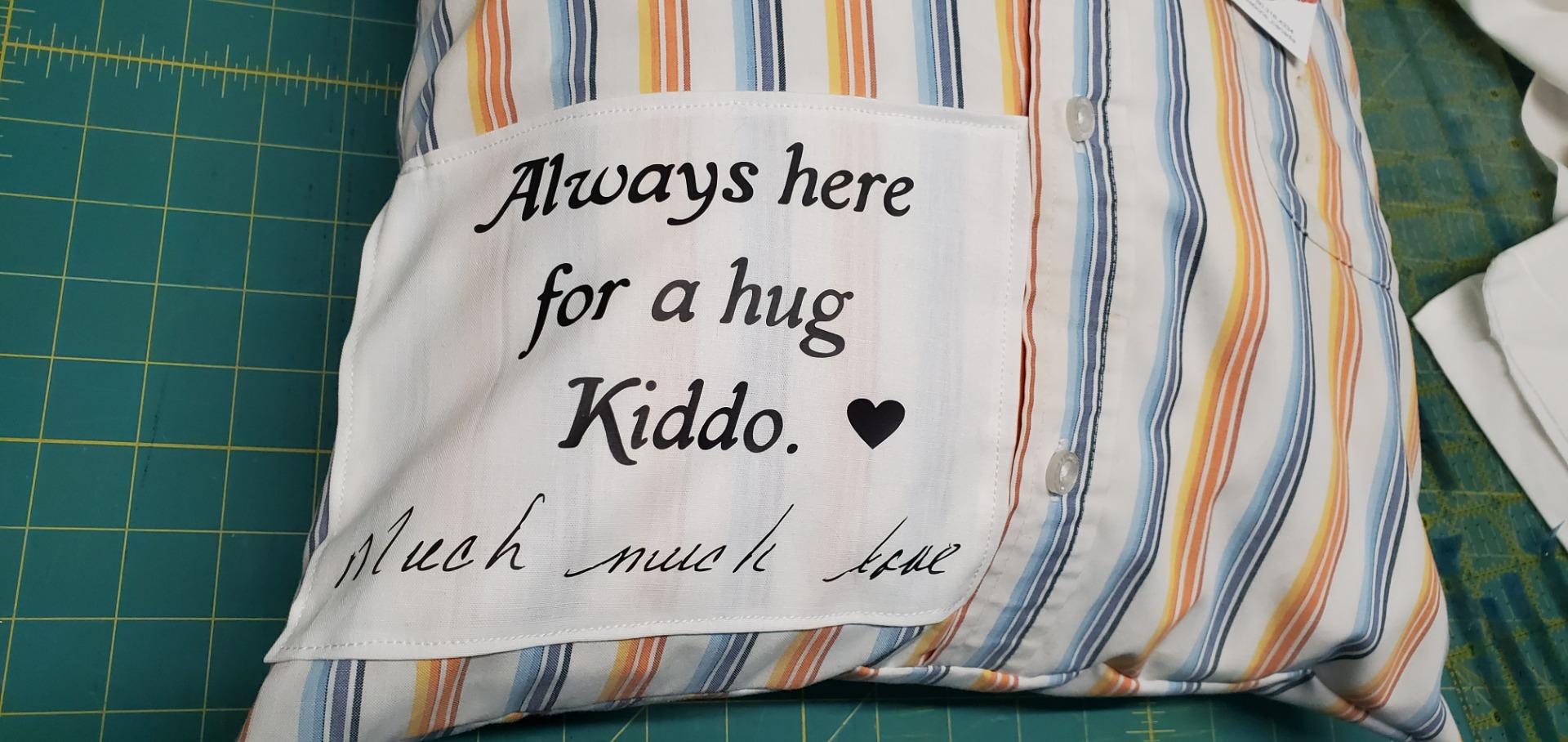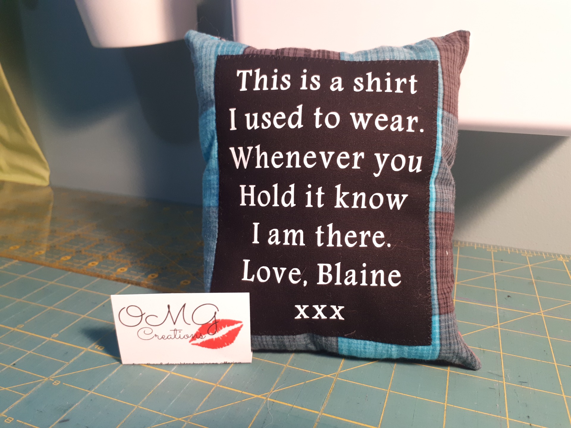 Absolutely! We have what we refer to as our 'standard' saying, but don't let that stop you from personalizing your own saying. If your loved one used to say 'love you to the moon and back' or 'love you till the cows come home' - let's use those. These pillows are about you and your loved ones. Even better, if you have an old birthday or holiday card from your loved one, I can even incorporate their writing into the patch (personalized as mentioned to the left) for that extra special touch.